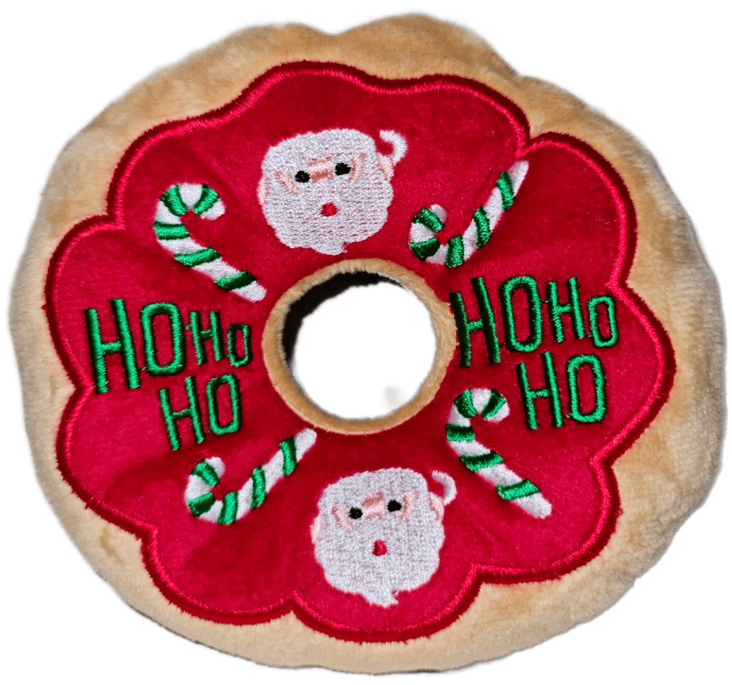 Offrez à votre toutou un jouet aussi mignon que festif avec cette peluche en forme de donut décorée aux couleurs de Noël 🎁.