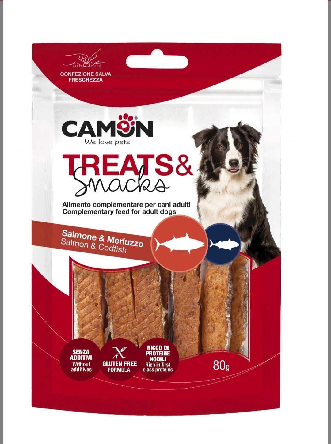 lanières de saumon avec peau de cabillaud de la marque Camon, présentées en sachet de 80 grammes, constituent une friandise savoureuse et nutritive pour vos compagnons canins